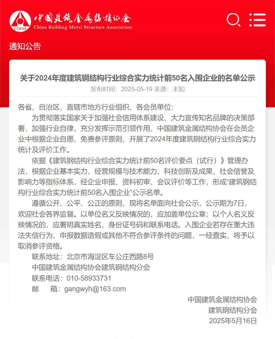 為貫徹落實國家關(guān)于加強社會信用體系建設(shè)、大力宣傳知名品牌的決策部署,加強行業(yè)自律,充分發(fā)揮示范引領(lǐng)作用,中國建筑金屬結(jié)構(gòu)協(xié)會在會員企業(yè)中根據(jù)企業(yè)自愿、免費參評原則,開展了2024年度建筑鋼結(jié)構(gòu)行業(yè)綜合實力統(tǒng)計及評價工作。依據(jù)《建筑鋼結(jié)構(gòu)行業(yè)綜合實力統(tǒng)計前50名評價要點(試行)》管理辦法,遵循公開、公平、公正的原則,根據(jù)企業(yè)基本實力、經(jīng)營規(guī)模與技術(shù)能力、科技創(chuàng)新及成果、社會信譽及影響力等指標體系,經(jīng)企業(yè)申報、資料初審、會議評價等工作,形成“建筑鋼結(jié)構(gòu)行業(yè)綜合實力統(tǒng)計前50名入圍企業(yè)”公示名單。